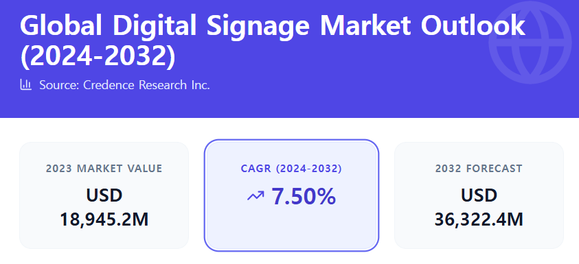 Credence Research Inc. has published a new study on the Global Digital Signage Market, highlighting steady growth driven by rising adoption across retail, transportation, healthcare, and corporate environments. The market was valued at USD 18,945.2 million in 2023 and is expected to reach USD 36,322.4 million by 2032, growing at a CAGR of 7.50% between 2024 and 2032.