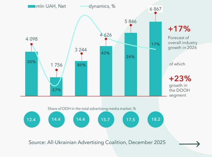 2026년을 향한 전망은 신중하지만 긍정적이다. DOOH 인프라에 대한 지속적인 투자와 함께, 전통 포맷에 대한 안정적인 수요가 병행되면서 성장세는 이어질 가능성이 크다. 현재의 예측이 현실화될 경우, 우크라이나 OOH는 단순한 보조 매체를 넘어 현대적 통합 커뮤니케이션의 핵심 플랫폼으로서 입지를 더욱 공고히 할 것으로 보인다.