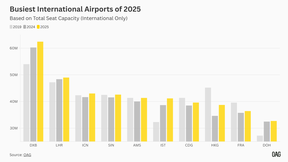 OAG 집계에 따르면 2025년 국제선 기준 가장 붐비는 공항은 두바이 국제공항이었으며, 2위는 런던 히드로공항이 차지했다. 인천국제공항은 이들 글로벌 메가 허브에 이어 3위에 오르며, 아시아 공항 가운데 가장 높은 순위를 기록했다. 이는 단순한 여객 회복을 넘어 인천이 글로벌 항공 네트워크에서 차지하는 전략적 중요성이 구조적으로 강화되고 있음을 보여준다.