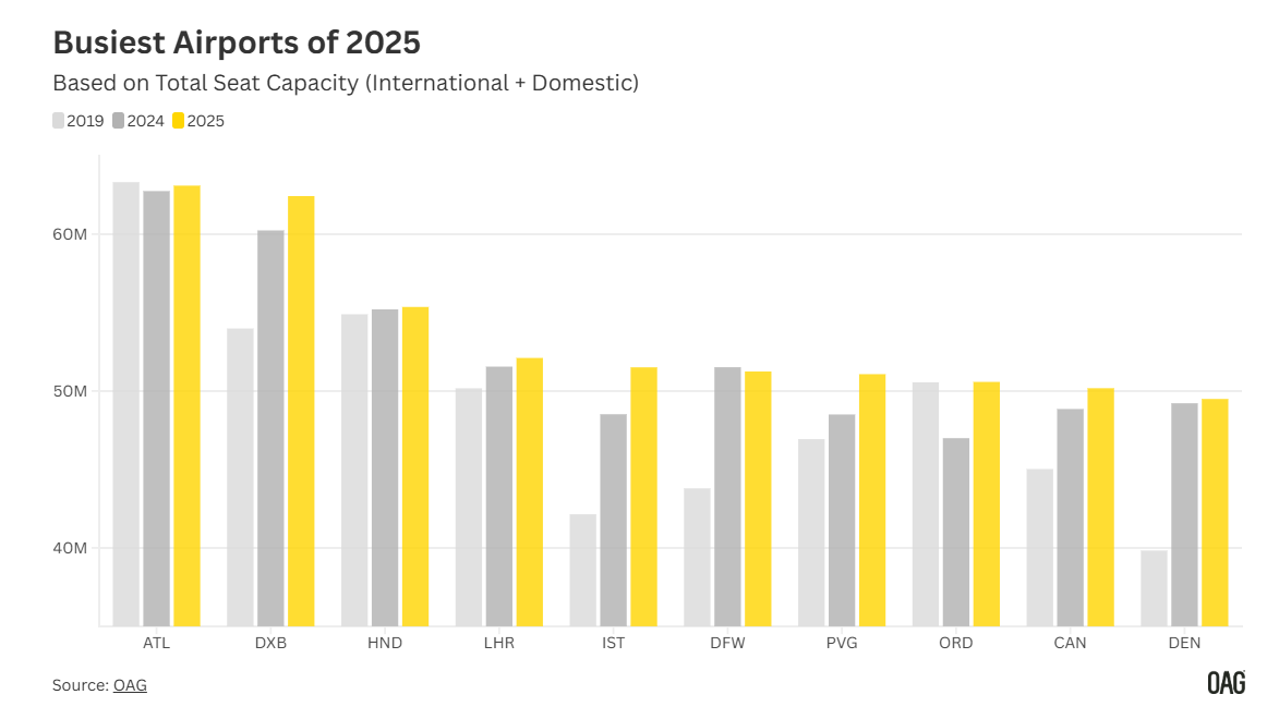 한편 국제선과 국내선을 합산한 ‘Busiest Airports of 2025’ 전체 순위에서는 미국 공항들이 상위권을 차지했다. 애틀랜타 하츠필드-잭슨 공항은 방대한 국내선 네트워크를 기반으로 세계에서 가장 붐비는 공항 지위를 유지했고, 댈러스 포트워스공항과 덴버국제공항이 그 뒤를 이었다. 이와 달리 인천국제공항은 국내선 비중이 낮음에도 국제선만으로 세계 3위에 올랐다는 점에서 구조적 경쟁력이 더욱 두드러진다.