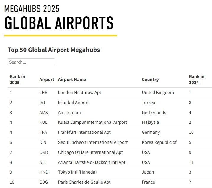 이번 조사에서 1위는 영국 런던 히드로 공항, 2위는 튀르키예 이스탄불 공항, 3위는 네덜란드 암스테르담 스키폴 공항이 차지했다. 아시아에서는 말레이시아 쿠알라룸푸르 국제공항이 4위, 일본 하네다 공항이 상위권에 이름을 올렸으며, 인천국제공항은 6위에 올라 동북아 허브로서의 입지를 굳혔다. 인천공항은 지난해 5위에서 한 계단 내려갔지만 최근 10년 동안 국제 연결성이 약 58% 증가하며 성장세를 이어갔다.