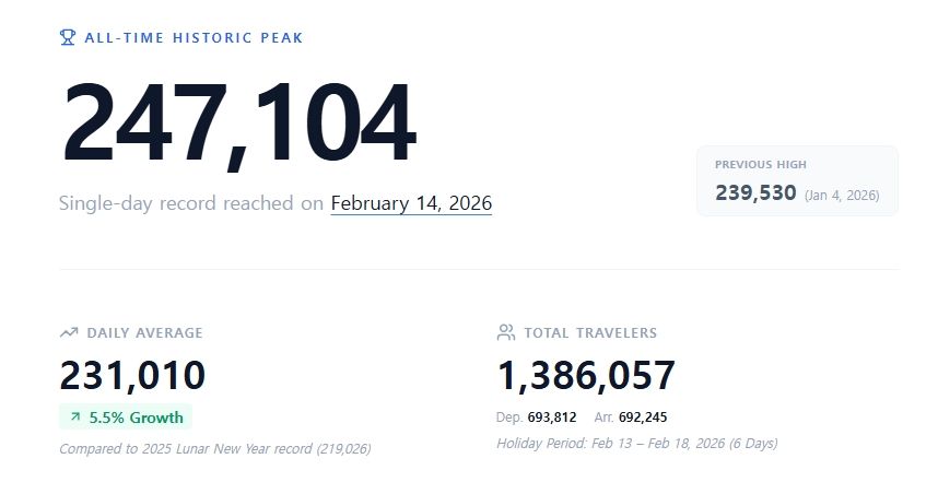 According to Incheon International Airport Corporation, a total of 1,386,057 passengers used the airport over the six-day period from February 13 to 18. Departing travelers accounted for 693,812 passengers, while 692,245 arrived in Korea. The daily average reached 231,010 passengers.