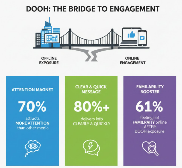 Attention and message delivery emerged as two of DOOH’s strongest attributes. Nearly seven in ten respondents said DOOH attracts more attention than other advertising media, and more than 80 percent agreed that it delivers information clearly and quickly. Importantly, 61 percent said that when they later encounter the same brand or product online, it feels more familiar if they had first seen it through DOOH. This finding reinforces the view of DOOH as a bridge between offline exposure and online engagement, rather than a standalone channel.