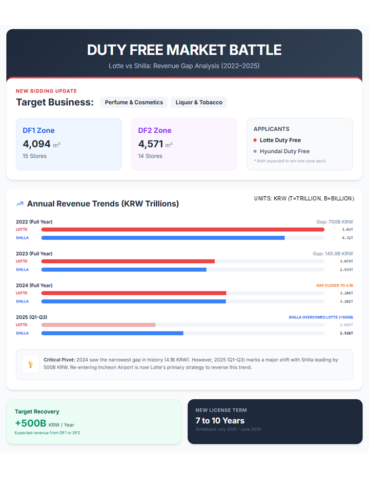 The duty free market at Incheon International Airport is entering a new strategic phase, with Lotte Duty Free and Hyundai Duty Free repositioning themselves for upcoming bidding rounds and long-term concessions. As passenger traffic continues to normalize after the pandemic and competition intensifies, the airport once again stands at the center of Korea’s travel retail industry.