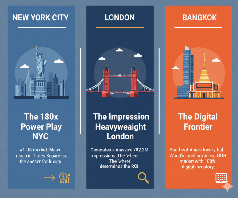 미국 뉴욕의 경우, 대규모 트래픽을 자랑하는 타임스스퀘어 중심의 집행이 반드시 최적의 선택은 아닌 것으로 분석됐다. 미드타운 윈도스케이프를 활용한 정밀 타기팅 전략은 일반적인 뉴욕 매체 대비 럭셔리 소비자 도달 가능성이 180배 높은 것으로 나타났다. 반면 타임스스퀘어 스펙타큘러와 같은 고노출 매체는 수백만 회의 노출을 제공하지만, 럭셔리 타깃 도달 가능성은 1.2배 수준에 그쳤다. 결과적으로 뉴욕 시장에서는 정밀 타기팅이 대량 도달 전략 대비 25배 높은 효율을 기록했으며, 전체 대중이 아닌 고소득 타깃군에 집중할수록 광고비 효율이 크게 개선되는 것으로 분석됐다.