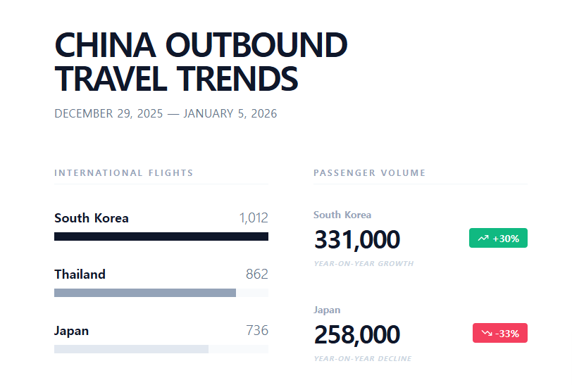 Between December 29, 2025 and January 4, 2026, a total of 1,012 international flights departed mainland China for South Korea, the highest among all overseas destinations. Thailand ranked second with 862 flights, while Japan followed in third place with 736 flights. Passenger volumes reinforced the same trend. From December 30 to January 5, the number of travelers flying between Chinese cities and South Korea rose 30% year-on-year to 331,000 passengers. In contrast, passenger traffic between China and Japan fell 33% from a year earlier to 258,000, according to CADAS estimates.