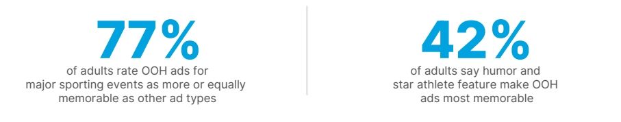 크리에이티브 요소는 팬들의 기억과 행동을 좌우하는 중요한 요인으로 드러났다. 응답자의 77%는 스포츠 이벤트 OOH 광고가 다른 광고보다 더 기억에 남거나 최소한 동일한 수준으로 기억된다고 답했다. 특히 ‘유머러스한 표현(42%)’, ‘스타 선수 등장(29%)’, ‘강렬한 비주얼(27%)’, ‘독창적 연출(26%)’ 등이 광고를 더 오래 기억하게 만드는 핵심 요소로 꼽혔다.