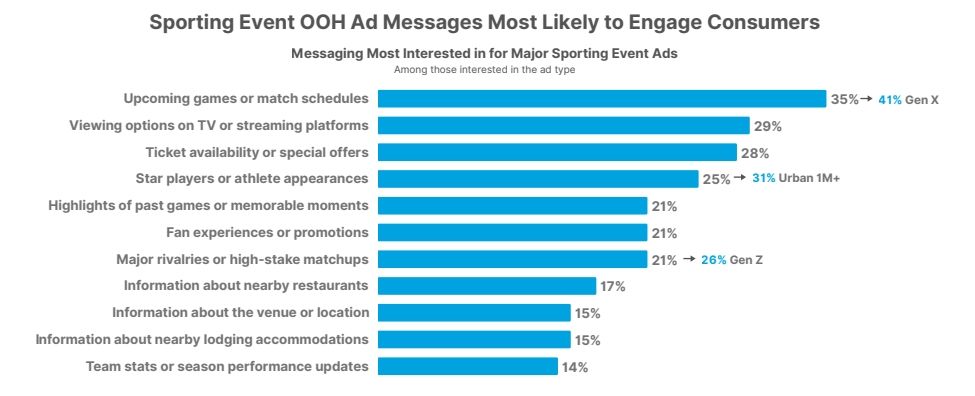 향후 대형 스포츠 이벤트는 OOH의 효과를 극대화할 무대가 될 전망이다. 응답자의 62%는 2026년 FIFA 월드컵 관련 옥외광고에 관심을 보였으며, 그중 96%는 광고를 본 뒤 추가 행동을 취하겠다고 답했다. 이는 세부 정보 탐색, 지인과 공유, 소셜 플랫폼 참여 등으로 이어질 가능성이 높다.