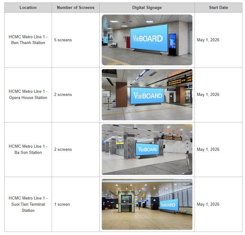 Vie BOARD has made a proposal to the government offices of Ho Chi Minh City for using digital signage within the city for cultural promotion and will begin installing its signage on May 1. The first 10 screens will be placed inside Ho Chi Minh City Metro Line 1 stations, with DOOH operations launching concurrently.
