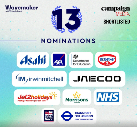The nominations recognize campaigns delivered in partnership with major brands and institutions including Asahi UK, AXA UK, the Department for Education, Dr. Oetker, Irwin Mitchell, JAECOO UK, Jet2.com and Jet2holidays, Morrisons, NHS England, the Royal Navy, and Transport for London.